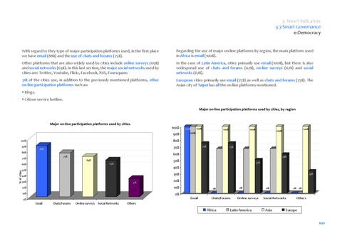 Other platforms that are also widely used by cities include online surveys (69%) and social networks (63%). In this last section, the major social networks used by cities are: Twitter, Youtube, Flickr, Facebook, RSS, Foursquare.