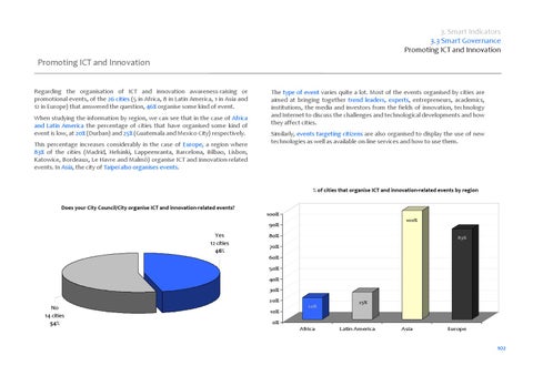 Promoting ICT and Innovation Regarding the organisation of ICT and innovation awareness‐raising or promotional events, of the 26 cities (5 in Africa, 8 in Latin America, 1 in Asia and 12 in Europe) that answered the question, 46% organise some kind of event. When studying the information by region, we can see that in the case of Africa and Latin America the percentage of cities that have organised some kind of event is low, at 20% (Durban) and 25% (Guatemala and Mexico City) respectively. This percentage increases considerably in the case of Europe, a region where 83% of the cities (Madrid, Helsinki, Lappeenranta, Barcelona, Bilbao, Lisbon, Katowice, Bordeaux, Le Havre and Malmö) organise ICT and innovation‐related events. In Asia, the city of Taipei also organises events.