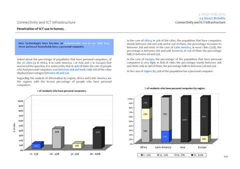In the case of Africa, in 50% of the cities, the population that have computers stands between 26% and 50%; and in 25% of them, the percentage increases to between 76% and 100%. In the case of Latin America, in most cities (75%), the percentage is between 26% and 50%; however, in 25% of them the percentage falls to between 0% and 25%. In the case of Europe, the percentage of the population that have personal computers is very high; in 86% of cities the percentage stands between 76% and 100%. Only in 14% of them, the percentage falls to between 51% and 75%. In the case of Taipei City, 91% of the population has a personal computer.