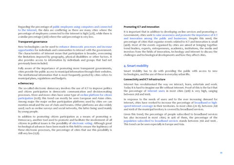 Regarding the percentage of public employees using computers and connected to the Internet, the data are conflicting as there are many cities where the percentage of employees connected to the Internet is high (32%), while there is a similar percentage (36%) where the said percentage is very low. Transparent governance New technologies can be used to enhance democratic processes and increase opportunities for individuals and communities to interact with the government. The characteristics of Internet mean that participation is broader, overcoming the limitations imposed by geography, physical disabilities or other factors. It also provides access to information by individuals and groups that had not previously been included. Fully aware of the importance of promoting more transparent governments, cities provide the public access to municipal information through their websites. The institutional information that is most frequently posted by cities refers to municipal plans, regulations and budgets. e‐Democracy The so‐called electronic democracy involves the use of ICT to improve politics and citizen participation in democratic communication and decision‐making processes. More and more cities have some type of on‐line platform for citizen participation (62%); this trend can mostly be seen European and Asian cities. Among major the major on‐line participation platforms used by cities we can mention email and the use of chats and forums. Other platforms are also widely used; such as on‐line surveys and social networks, the latter being used mainly by young people. In addition to promoting citizen participation as a means of promoting e‐ Democracy, another tool used to promote and facilitate the involvement of all citizens in political issues is the possibility of electronic voting. Although great technological advances have been made in this field to ensure the legitimacy of these electronic processes, the percentage of cities that use this possibility is still very low (15%).