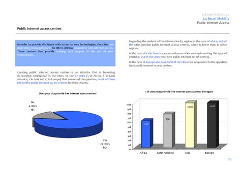 Regarding the analysis of the information by region, in the case of Africa, 60% of the cities provide public Internet access centres, which is lower than in other regions. In the case of Latin America, more and more cities are implementing this type of initiative. 75% of the cities now have public Internet access centres. In the case of Europe and Asia, 100% of the cities that responded to the question have public Internet access centres.