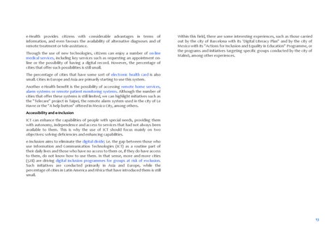 e‐Health provides citizens with considerable advantages in terms of information, and even favours the availability of alternative diagnoses and of remote treatment or tele‐assistance. Through the use of new technologies, citizens can enjoy a number of on‐line medical services, including key services such as requesting an appointment on‐ line or the possibility of having a digital record. However, the percentage of cities that offer such possibilities is still small.