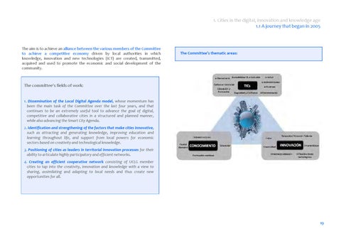 1. Dissemination of the Local Digital Agenda model, whose momentum has been the main task of the Committee over the last four years, and that continues to be an extremely useful tool to advance the goal of digital, competitive and collaborative cities in a structured and planned manner, while also advancing the Smart City Agenda. 2. Identification and strengthening of the factors that make cities innovative, such as attracting and generating knowledge, improving education and learning throughout life, and support from local powers for economic sectors based on creativity and technological knowledge. 3. Positioning of cities as leaders in territorial innovation processes for their ability to articulate highly participatory and efficient networks. 4. Creating an efficient cooperative network consisting of UCLG member cities to tap into the creativity, innovation and knowledge with a view to sharing, assimilating and adapting to local needs and thus create new opportunities for all.