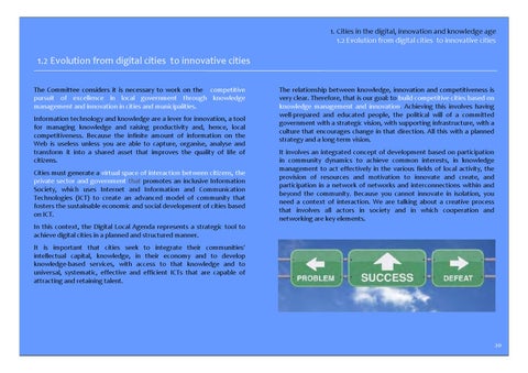 1.2 Evolution from digital cities to innovative cities The Committee considers it is necessary to work on the competitive pursuit of excellence in local government through knowledge management and innovation in cities and municipalities. Information technology and knowledge are a lever for innovation, a tool for managing knowledge and raising productivity and, hence, local competitiveness. Because the infinite amount of information on the Web is useless unless you are able to capture, organise, analyse and transform it into a shared asset that improves the quality of life of citizens. Cities must generate a virtual space of interaction between citizens, the private sector and government that promotes an inclusive Information Society, which uses Internet and Information and Communication Technologies (ICT) to create an advanced model of community that fosters the sustainable economic and social development of cities based on ICT.