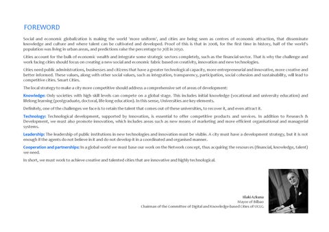 FOREWORD Social and economic globalization is making the world 'more uniform', and cities are being seen as centres of economic attraction, that disseminate knowledge and culture and where talent can be cultivated and developed. Proof of this is that in 2008, for the first time in history, half of the world's population was living in urban areas, and predictions raise the percentage to 70% in 2050. Cities account for the bulk of economic wealth and integrate some strategic sectors completely, such as the financial sector. That is why the challenge and work facing cities should focus on creating a new social and economic fabric based on creativity, innovation and new technologies. Cities need public administrations, businesses and citizens that have a greater technological capacity, more entrepreneurial and innovative, more creative and better informed. These values, along with other social values, such as integration, transparency, participation, social cohesion and sustainability, will lead to competitive cities. Smart Cities. The local strategy to make a city more competitive should address a comprehensive set of areas of development: Knowledge: Only societies with high skill levels can compete on a global stage. This includes initial knowledge (vocational and university education) and lifelong learning (postgraduate, doctoral, life‐long education). In this sense, Universities are key elements. Definitely, one of the challenges we face is to retain the talent that comes out of these universities, to recover it, and even attract it. Technology: Technological development, supported by Innovation, is essential to offer competitive products and services. In addition to Research & Development, we must also promote innovation, which includes areas such as new means of marketing and more efficient organisational and managerial systems. Leadership: The leadership of public institutions in new technologies and innovation must be visible. A city must have a development strategy, but it is not enough if the agents do not believe in it and do not develop it in a coordinated and organised manner. Cooperation and partnerships: In a global world we must base our work on the Network concept, thus acquiring the resources (financial, knowledge, talent) we need. In short, we must work to achieve creative and talented cities that are innovative and highly technological.