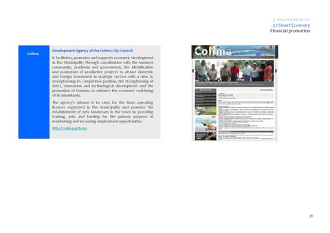 Development Agency of the Colima City Council: It facilitates, promotes and supports economic development in the Municipality through coordination with the business community, academia and government, the identification and promotion of productive projects to attract domestic and foreign investment in strategic sectors with a view to strengthening its competitive position, the strengthening of SMEs, innovation and technological development and the promotion of tourism, to enhance the economic well‐being of its inhabitants. The agency's mission is to cater for the 8000 operating licenses registered in the municipality and promote the establishment of new businesses in the town by providing training, jobs and funding for the primary purpose of maintaining and increasing employment opportunities. http://colima.gob.mx