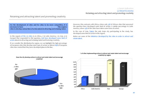 In this regard, of the 20 cities (3 in Africa, 7 in Latin America, 1 in Asia, 9 in Europe) that responded to this question, 65% have developed some kind of action aimed at attracting and retaining talent and fostering creativity.