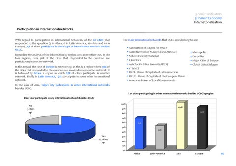 3. Smart Indicators 3.1 Smart Economy Internationalization Participation in international networks With regard to participation in international networks, of the 20 cities that responded to the question (3 in Africa, 6 in Latin America, 1 in Asia and 10 in Europe), 75% of them participate in some type of international network besides UCLG.