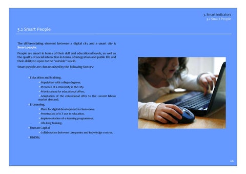 3.2 Smart People The differentiating element between a digital city and a smart city is Smart people. People are smart in terms of their skill and educational levels, as well as the quality of social interaction in terms of integration and public life and their ability to open to the "outside" world. Smart people are characterised by the following factors: •Education and training. Population with college degrees. Presence of a University in the City. Priority areas for educational offers. Adaptation of the educational offer to the current labour market demand.
