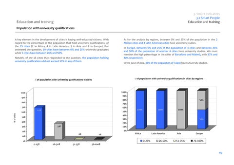 As for the analysis by regions, between 0% and 25% of the population in the 2 African cities and 4 Latin American cities have university studies. In Europe, between 0% and 25% of the population of 4 cities and between 26% and 50% of the population of another 4 cities have university studies. We must mention the high percentage in the cities of Barcelona and Malmö, with 37% and 40% respectively. In the case of Asia, 33% of the population of Taipei have university studies.