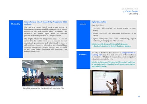 The city of Bordeaux has launched a comprehensive e‐ Learning plan. One of its main objectives is the installation of interactive whiteboards in each classroom in compulsory education schools in the city. http://www.bordeaux.fr/ebx/portals/ebx.portal?_nfpb=true &_pageLabel=pgPresStand8&classofcontent=presentation Standard&id=49506