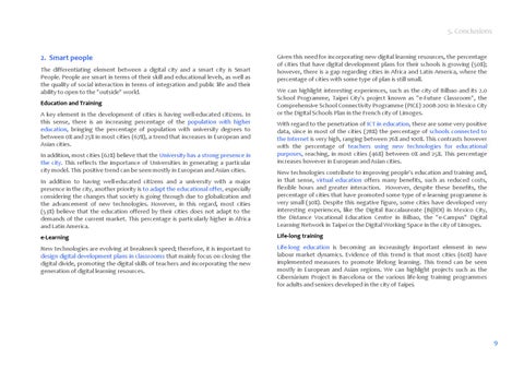 2. Smart people The differentiating element between a digital city and a smart city is Smart People. People are smart in terms of their skill and educational levels, as well as the quality of social interaction in terms of integration and public life and their ability to open to the "outside" world. Education and Training A key element in the development of cities is having well‐educated citizens. In this sense, there is an increasing percentage of the population with higher education, bringing the percentage of population with university degrees to between 0% and 25% in most cities (67%), a trend that increases in European and Asian cities. In addition, most cities (62%) believe that the University has a strong presence in the city. This reflects the importance of Universities in generating a particular city model. This positive trend can be seen mostly in European and Asian cities.