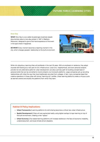 Habitat III Policy Implications: »» Urban Frameworks | Learning platforms for skill-sharing becomes a critical new urban infrastructure. »» S patial Development | Cities will use augmented reality using digital overlays to layer learning on top of the built environment, creating a new “space.” »» U rban Economy | City-based learning platforms will increase resilience in the face of economic instability, underemployment, and local climate-driven disasters.