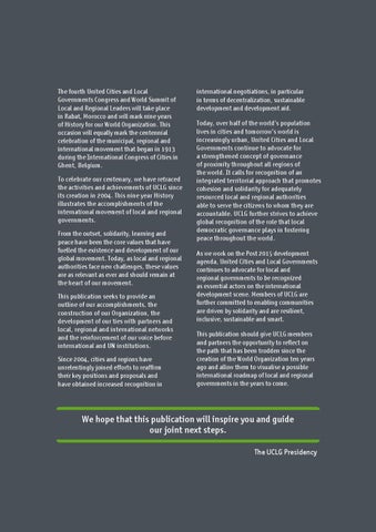 The fourth United Cities and Local Governments Congress and World Summit of Local and Regional Leaders will take place in Rabat, Morocco and will mark nine years of History for our World Organization. This occasion will equally mark the centennial celebration of the municipal, regional and international movement that began in 1913 during the International Congress of Cities in Ghent, Belgium. To celebrate our centenary, we have retraced the activities and achievements of UCLG since its creation in 2004. This nine year History illustrates the accomplishments of the international movement of local and regional governments. From the outset, solidarity, learning and peace have been the core values that have fuelled the existence and development of our global movement. Today, as local and regional authorities face new challenges, these values are as relevant as ever and should remain at the heart of our movement. This publication seeks to provide an outline of our accomplishments, the construction of our Organization, the development of our ties with partners and local, regional and international networks and the reinforcement of our voice before international and UN institutions. Since 2004, cities and regions have unrelentingly joined efforts to reaffirm their key positions and proposals and have obtained increased recognition in