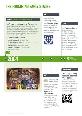 The promising early stages MAY MAY · FOUNDING CONGRESS IN PARIS The Founding Congress in Paris saw the biggest gathering ever of mayors, concillors and elected representatives of cities an local and regional goverments to officially create the world organization “United Cities and local Governments”, with the mission of representing and defending the interest of local governments on the world stage.