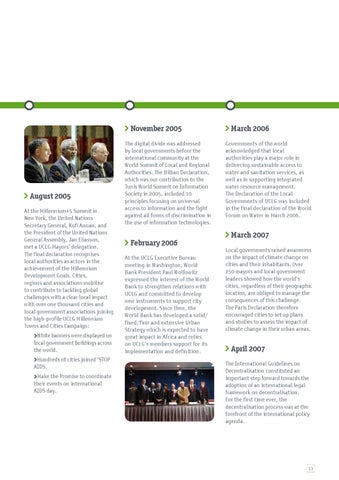 August 2005 At the Millennium+5 Summit in New York, the United Nations Secretary General, Kofi Annan, and the President of the United Nations General Assembly, Jan Eliasson, met a UCLG Mayors’ delegation. The final declaration recognises local authorities as actors in the achievement of the Millennium Development Goals. Cities, regions and associations mobilise to contribute to tackling global challenges with a clear local impact with over one thousand cities and local government associations joining the high-profile UCLG Millennium Towns and Cities Campaign: White banners were displayed on local government buildings across the world. Hundreds of cities joined ‘STOP AIDS. Make the Promise to coordinate their events on international AIDS day.