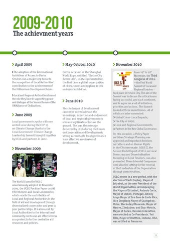 April 2009 The adoption of the International Guidelines of Access to Basics Services was a major step towards the recognition of Local Authorities’ contribution to the achievement of the Millennium Development Goals. Local and Regional Authorities stressed the role they have in supporting peace and dialogue at the Second Forum of the UN Alliance of Civilizations.