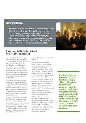 New Challenges We are additionally experiencing innovation and hope: We see the youth in our cities wanting to promote change. We enjoy the capacity to rethink our identity and discovering new ways forward. Our ability to acknowledge change and opportunities will be pivotal for a sustainable future. This will only happen if we work together in our united organization, UCLG.