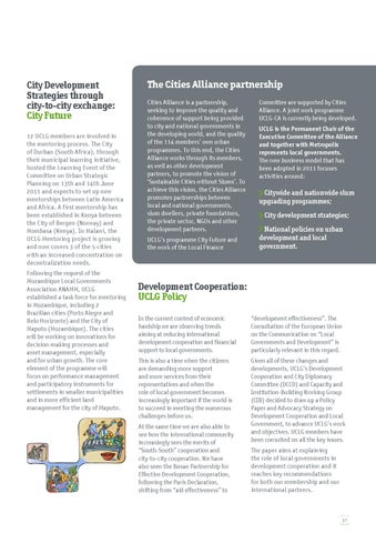 City Development Strategies through city-to-city exchange: City Future 12 UCLG members are involved in the mentoring process. The City of Durban (South Africa), through their municipal learning initiative, hosted the Learning Event of the Committee on Urban Strategic Planning on 13th and 14th June 2011 and expects to set up new mentorships between Latin America and Africa. A first mentorship has been established in Kenya between the City of Bergen (Norway) and Mombasa (Kenya). In Malawi, the UCLG Mentoring project is growing and now covers 3 of the 5 cities with an increased concentration on decentralization needs. Following the request of the Mozambique Local Governments Association ANAMM, UCLG established a task force for mentoring in Mozambique, including 2 Brazilian cities (Porto Alegre and Belo Horizonte) and the City of Maputo (Mozambique). The cities will be working on innovations for decision-making processes and asset management, especially and for urban growth. The core element of the programme will focus on performance management and participatory instruments for settlements in smaller municipalities and in more efficient land management for the city of Maputo.