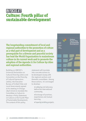 The longstanding commitment of local and regional authorities to the promotion of culture as a vital part of development and as a prerequisite for a diverse and peaceful society has lead the World Organization to mainstream culture in its current work and to promote the adoption of the Agenda 21 for Culture by cities and regional authorities. Building on UNESCO’s Universal Declaration on Cultural Diversity (2001) and Convention on the Diversity of Cultural Expressions (2005), the Executive Bureau of United Cities and Local Governments agreed at its meeting in Chicago (April 2010) to mandate the Committee on Culture to develop a Policy Statement on Culture as the Fourth Pillar of Sustainable Development. The content of this policy