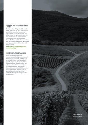 Digital and Knowledge-Based Cities The Committee of Digital and Knowledgebased Cities (CDC) of UCLG aims to create an efficient network of cooperation integrated by Local Authorities to take advantage of the opportunities that the new information and communication technologies (ICT), innovation and knowledge bring, and to share, assimilate and adapt them to local needs, and create new opportunites for all the cities and municipalities. www.cities-localgovernments.org/ committees/cdc/