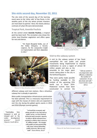 Visit to the subway system A visit to the subway system of Sao Paulo exemplified the vast public and private investments being implemented to improve mobilization to serve a region of almost 40 million people and also as the preamble to the major sport “Subway system is events taking place in the city in very impressive and the forthcoming years. efficient, evident by They were partly made possible by funding available in the context of the upcoming FIFA world cup in Brazil 2014. Pedestrian tunnels have been Picture 11: New driverless subway in Sao Paulo constructed to connect the different subway and train stations. Also a driverless subway line is already in operation.