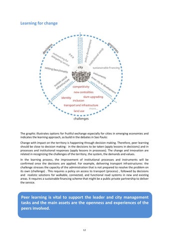 The graphic illustrates options for fruitful exchange especially for cities in emerging economies and indicates the learning approach, as build in the debates in Sao Paulo: Change with impact on the territory is happening through decision making. Therefore, peer learning should be close to decision making: in the decisions to be taken (apply lessons in decisions) and in processes and institutional responses (apply lessons in processes). The change and innovation are related in recognizing the challenges of the territory, the system, the demands and values. In the learning process, the improvement of institutional processes and instruments will be confirmed once the decisions are applied. For example, delivering transport infrastructures: the challenge stresses the capacity of the administration that is not prepared to resolve the problem on its own (challenge) . This requires a policy on access to transport (process) , followed by decisions and realistic solutions for walkable, connected, and functional road systems in new and existing areas. It requires a sustainable financing scheme that might be a public private partnership to deliver the service.