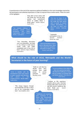 “To put practitioners from different cities, but experiencing similar development challenges, in touch with one another to exchange ideas and debate options” Mark Byerley, South Africa “Continue as this experience should in all my works. I feel that learning takes place at peer level and this process reinforced this belief. Thank you” Gareth Haysom, South Africa