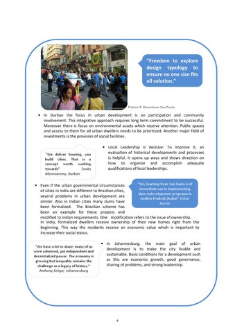 “Yes, learning from Sao Paulo is of Even if the urban governmental circumstances immediate use in implementing of cities in India are different to Brazilian cities, slum redevelopment programs in several problems in urban development are Andhra Pradesh (India)” Vishar similar. Also in Indian cities many slums have Kumar been formalized. The Brazilian scheme has been an example for these projects and modified to Indian requirements. One modification refers to the issue of ownership. In India, formalized dwellers receive ownership of their new homes right from the beginning. This way the residents receive an economic value which is important to increase their social status. “We have a lot to share: many of us were colonized, got independent and decentralized power. The economy is growing but inequality remains the challenge as a legacy of history.“ Anthony Selepe, Johannesburg