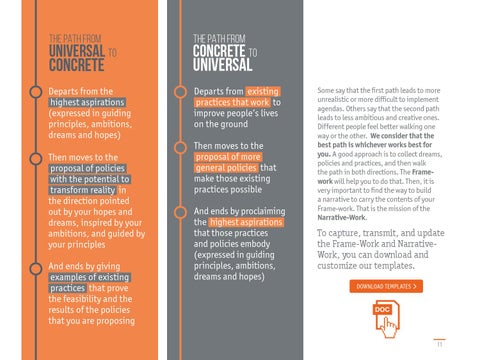 Then moves to the proposal of policies with the potential to transform reality in the direction pointed out by your hopes and dreams, inspired by your ambitions, and guided by your principles And ends by giving examples of existing practices that prove the feasibility and the results of the policies that you are proposing