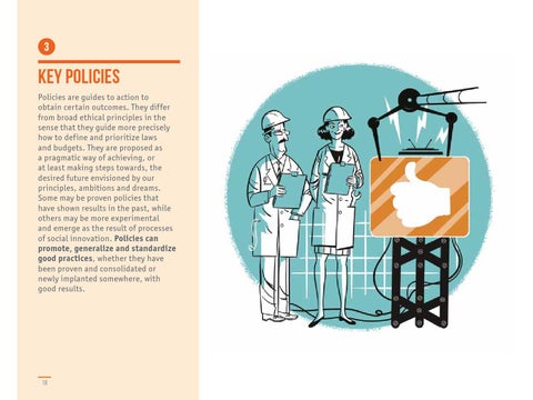 KEY POLICIES Policies are guides to action to obtain certain outcomes. They differ from broad ethical principles in the sense that they guide more precisely how to define and prioritize laws and budgets. They are proposed as a pragmatic way of achieving, or at least making steps towards, the desired future envisioned by our principles, ambitions and dreams. Some may be proven policies that have shown results in the past, while others may be more experimental and emerge as the result of processes of social innovation. Policies can promote, generalize and standardize good practices, whether they have been proven and consolidated or newly implanted somewhere, with good results.