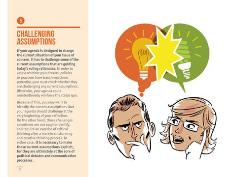 CHALLENGING ASSUMPTIONS If your agenda is designed to change the current situation of your issue of concern, it has to challenge some of the current assumptions that are guiding today’s ruling rationales. In order to assess whether your dreams, policies or practices have transformational potential, your must check whether they are challenging any current assumptions. Otherwise, your agenda could unintentionally reinforce the status quo. Because of this, you may want to identify the current assumptions that your agenda should challenge at the very beginning of your reflection. On the other hand, those challenges sometimes are not easy to identify, and require an exercise of critical thinking after a more brainstorming and creative thinking process. In either case, it is necessary to make those current assumptions explicit, for they are ultimately at the core of political debates and communication processes. 22