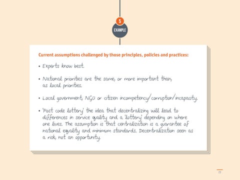 Current assumptions challenged by those principles, policies and practices: Experts know best. National priorities are the same, or more important than, as local priorities. Local government, NGO or citizen incompetency/corruption/incapacity. ‘Post code lottery’ the idea that decentralizing will lead to differences in service quality and a ‘lottery’ depending on where one lives. The assumption is that centralization is a guarantee of national equality and minimum standards. Decentralization seen as a risk, not an opportunity.