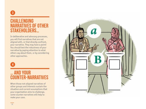 CHALLENGING NARRATIVES OF OTHER STAKEHOLDERS‌ In deliberative and advocacy processes, you will find narratives that are not aligned with, or that directly confront, your narrative. They may have a point! You should test the robustness of your narrative by paying attention to what others say about them, or by considering other approaches.