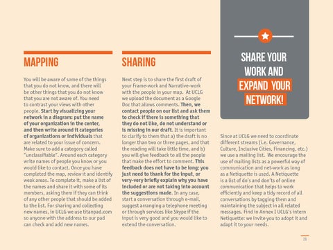 You will be aware of some of the things that you do not know, and there will be other things that you do not know that you are not aware of. You need to contrast your views with other people. Start by visualizing your network in a diagram: put the name of your organization in the center, and then write around it categories of organizations or individuals that are related to your issue of concern. Make sure to add a category called “unclassifiable”. Around each category write names of people you know or you would like to contact. Once you have completed the map, review it and identify weak areas. To complete it, make a list of the names and share it with some of its members, asking them if they can think of any other people that should be added to the list. For sharing and collecting new names, in UCLG we use titanpad.com so anyone with the address to our pad can check and add new names.