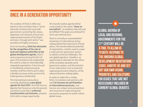 ONCE IN A GENERATION OPPORTUNITY The creation of UCLG in 2004 was based on the conviction that a “world advocate of democratic local selfgovernment, promoting the values, objectives and interests of local and regional governments of all shapes and sizes, through joint action” was possible and highly necessary. Since its founding, UCLG has advocated for the recognition of the role of local and regional authorities in the global development agenda. UCLG’s work programme during the first 10 years of its existence has emphasized the need to create an internationally respected organization; it has focused on facilitating contact among its members and has tried to put in place a flexible structure at the service of its heterogeneous membership. The international community is currently developing a new global agenda for Post 2015. The shift from an Agenda that focuses on only the poorest countries to one that is universal, transformative and inclusive, presents UCLG with a unique opportunity.