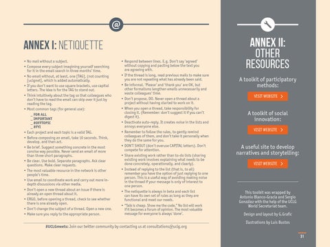 ANNEX I: NETIQUETTE • No mail without a subject. • Compose every subject imagining yourself searching for it in the email search in three months’ time. • No email without, at least, one [TAG], (not counting [uclgnet], which is added automatically. • If you don’t want to use square brackets, use capital letters. The idea is for the TAG to stand out. • Think intuitively about the tag so that colleagues who don’t have to read the email can skip over it just by reading the tag. • Most common tags (for general use): _ FOR ALL _ IMPORTANT _ #OFFTOPIC _ #FYI • Each project and each topic is a valid TAG. • Before composing an email, take 10 seconds. Think, develop, and then act. • Be brief. Suggest something concrete in the most concise way possible. Never send an email of more than three short paragraphs. • Be clear. Use bold. Separate paragraphs. Ask clear questions. Make clear requests. • The most valuable resource in the network is other people’s time. • Use email to coordinate work and carry out more indepth discussions via other media. • Don’t open a new thread about an issue if there is already an open thread about it. • ERGO, before opening a thread, check to see whether there is one already open. • Don’t change the subject of a thread. Open a new one. • Make sure you reply to the appropriate person.