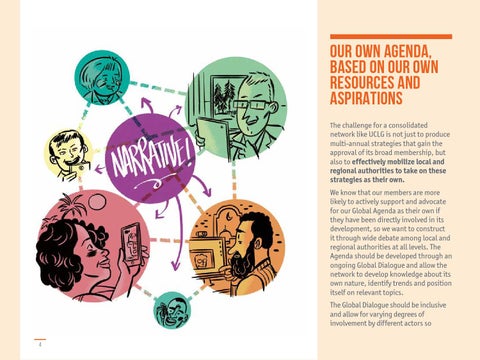 network like UCLG is not just to produce multi-annual strategies that gain the approval of its broad membership, but also to effectively mobilize local and regional authorities to take on these strategies as their own. We know that our members are more likely to actively support and advocate for our Global Agenda as their own if they have been directly involved in its development, so we want to construct it through wide debate among local and regional authorities at all levels. The Agenda should be developed through an ongoing Global Dialogue and allow the network to develop knowledge about its own nature, identify trends and position itself on relevant topics. The Global Dialogue should be inclusive and allow for varying degrees of involvement by different actors so 4