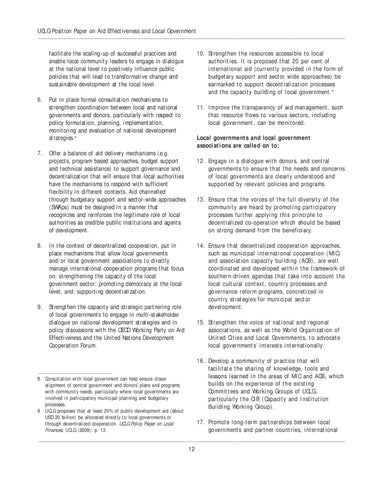 10. Strengthen the resources accessible to local authorities. It is proposed that 20 per cent of international aid (currently provided in the form of budgetary support and sector wide approaches) be earmarked to support decentralization processes and the capacity building of local government.9
