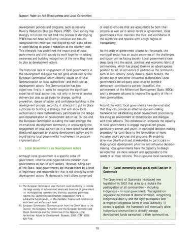 Box 1 – Local ownership and social mobilization in Guatemala The Government of Guatemala introduced new legislation in 2002 that aims to stimulate the participation of all communities – including indigenous – in local government. The legislation regulates the process of decentralization, recognizing indigenous identity and the right to preserve and strengthen indigenous forms of local authority. If correctly applied, the framework will eventually allow indigenous communities to directly manage development funds earmarked to their communities,