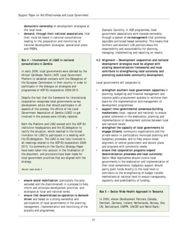 Both the Platform and LGAZ worked with the ACP EU institution headquarters and the EC delegation to rectify the situation, which resulted in the formal invitation for LGAZ to participate in a meeting with the EC delegation. The LGAZ is now fully involved in all meetings related to the ACP-EU cooperation 20082013. Its comments on the Country Strategy Paper have been taken into account in the finalisation of the document, and provisions have been made for local government priorities that are aligned with the strategy.