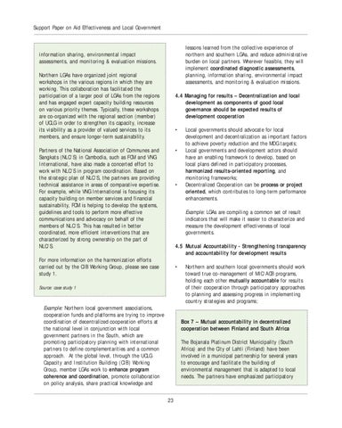 Box 7 – Mutual accountability in decentralized cooperation between Finland and South Africa The Bojanala Platinum District Municipality (South Africa) and the City of Lahti (Finland) have been involved in a municipal partnership for several years to encourage and facilitate the building of environmental management that is adapted to local needs. The partners have emphasized participatory