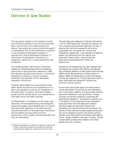 The case studies included in this compilation provide some illustrative examples of how the local government sector can contribute to the effectiveness of aid delivery. They explore how various interventions support or are consistent with the Paris Declaration principles of i) local ownership of development strategies; ii) alignment with national development strategies; iii) harmonization of development interventions; iv) managing for results; and v) mutual accountability and transparency.
