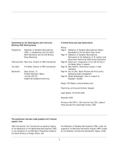 © United Cities and Local Governments Photos: Page 8 Federation of Canadian Municipalities, Mayors Roundtable at the 3rd World Urban Forum. Page 14 Federation of Canadian Municipalities, Participants of the Federation of Sri Lankan Local Government Authorities' 2008 Annual Conference. Page 26 Grand Lyon, Inauguration of the well drilling in the Bekaa Valley in Lebanon. Page 36 Sara Hoeflich, Construction project in Aceh, Indonesia. Page 44 City of Lahti, South Africans and Finns jointly developing waste management. Page 52 Renske Steenbergen, View of a suburb of Guayaquil, Ecuador.