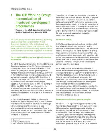 Programme coordination – concrete examples In addition to the regular exchange of information, the Working Group has selected five pilot countries in which CIB members have agreed to pay special attention to harmonizing their ACB and MIC programmes. In these countries (Mali, Ghana, Nicaragua, Burkina Faso and Zimbabwe), one CIB member together with the partner country LGA serves as the focal point for strengthening coordination and harmonization.23 It was further agreed that the partners would work within programme coordination guidelines adopted by the CIB at its annual