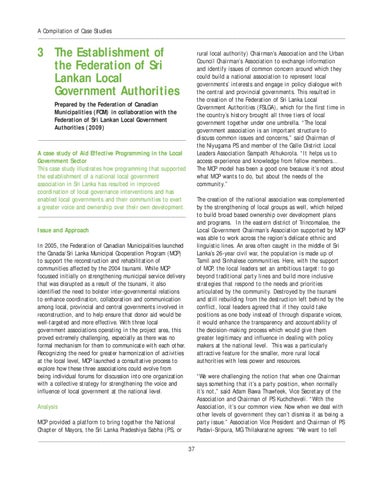 rural local authority) Chairman’s Association and the Urban Council Chairman’s Association to exchange information and identify issues of common concern around which they could build a national association to represent local governments’ interests and engage in policy dialogue with the central and provincial governments. This resulted in the creation of the Federation of Sri Lanka Local Government Authorities (FSLGA), which for the first time in the country’s history brought all three tiers of local government together under one umbrella. “The local government association is an important structure to discuss common issues and concerns,” said Chairman of the Niyugama PS and member of the Galle District Local Leaders Association Sampath Athukorola. “It helps us to access experience and knowledge from fellow members… The MCP model has been a good one because it’s not about what MCP wants to do, but about the needs of the community.”