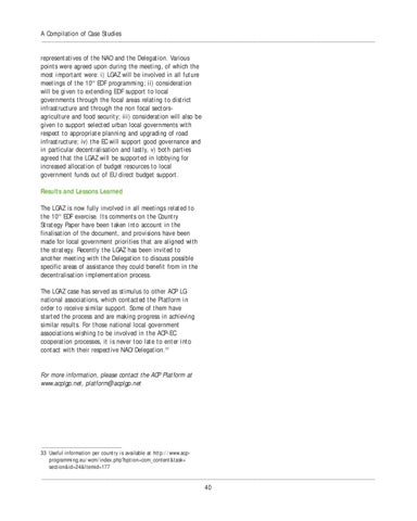 representatives of the NAO and the Delegation. Various points were agreed upon during the meeting, of which the most important were: i) LGAZ will be involved in all future meetings of the 10th EDF programming; ii) consideration will be given to extending EDF support to local governments through the focal areas relating to district infrastructure and through the non focal sectorsagriculture and food security; iii) consideration will also be given to support selected urban local governments with respect to appropriate planning and upgrading of road infrastructure; iv) the EC will support good governance and in particular decentralisation and lastly, v) both parties agreed that the LGAZ will be supported in lobbying for increased allocation of budget resources to local government funds out of EU direct budget support. Results and Lessons Learned The LGAZ is now fully involved in all meetings related to the 10th EDF exercise. Its comments on the Country Strategy Paper have been taken into account in the finalisation of the document, and provisions have been made for local government priorities that are aligned with the strategy. Recently the LGAZ has been invited to another meeting with the Delegation to discuss possible specific areas of assistance they could benefit from in the decentralisation implementation process. The LGAZ case has served as stimulus to other ACP LG national associations, which contacted the Platform in order to receive similar support. Some of them have started the process and are making progress in achieving similar results. For those national local government associations wishing to be involved in the ACP-EC cooperation processes, it is never too late to enter into contact with their respective NAO/Delegation.33