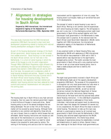 This case study illustrates how the VNG International programme LOGO South has served to align local level development programming related to housing with national housing development strategies in South Africa. As part of the housing development strategy of the South African government, social housing was one of the areas that needed attention. Social housing is a new concept in the South African context, but far from new in the Netherlands. It is a form of rental housing in which the owner of the houses is a not for profit organization. Through VNG’s LOGO South Programme, eight different city twinnings are addressing the issue of social housing in projects that started in 2005/2006 and will end by 2011. As a first step, the projects aim to elaborate a draft of local housing strategies and policies. Support is also given to Social Housing Institutions that play a pivotal role in the South African social housing strategy. Since the projects started, new legislation has been drafted and adopted, local housing policies have been adopted by local councils and practical implementation will take place in the coming years.