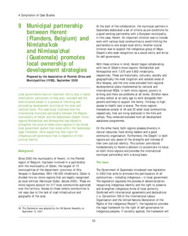 Local governments have an important role to play in social mobilization, particularly to help poor, excluded and the discriminated people in a process of informing and articulating development priorities at the local and national levels. This case-study illustrates how the international municipal partnership between the Belgian municipality of Herent and the Guatemalan Q’eqchi’ microregions Nimlaha’kok and Nimlasa’chal has helped to strengthen the voice of these micro-regions in the formal local government system that exists within the Guatemalan legal framework, while supporting their claim for indigenous self-governance that is respectful of their cultural identity.