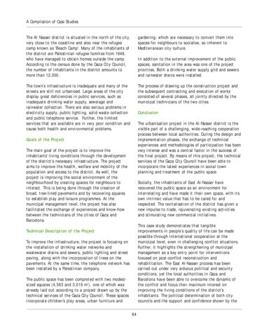 Conclusion The urbanisation project in the Al-Nasser district is the visible part of a challenging, wide-reaching cooperation process between local authorities. During the design and implementation phases, the exchange of technical experiences and methodologies of participation has been very intense and was a central factor in the success of the final project. By means of this project, the technical services of the Gaza City Council have been able to incorporate the latest experiences in social town planning and treatment of the public space.